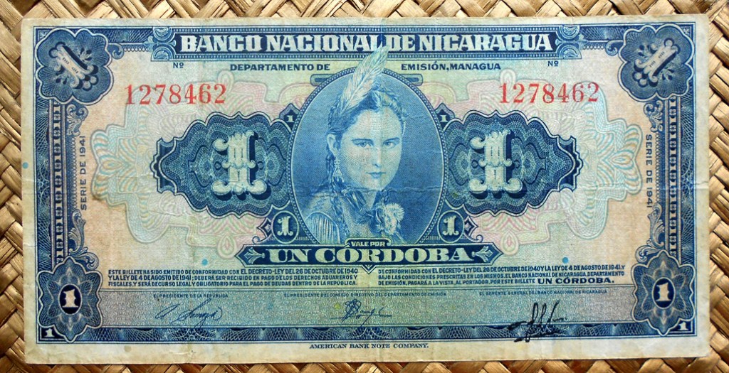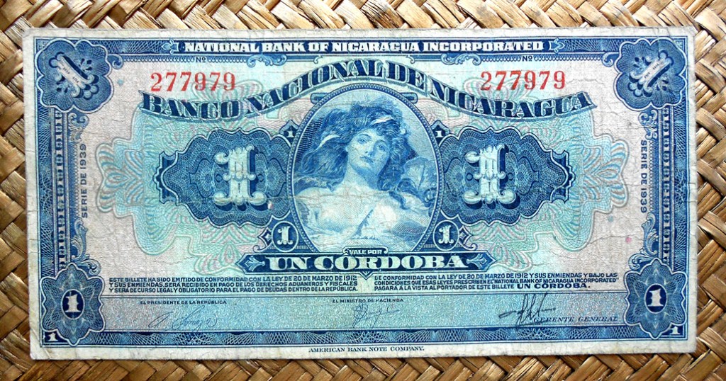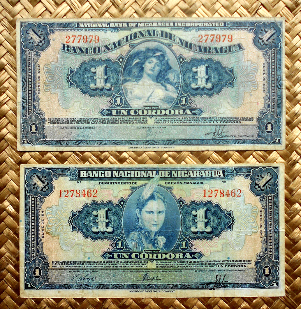 La pareja de billetes que comparamos esta vez nos traslada a mediados del pasado siglo y al territorio centroamericano de Nicaragua. Revisaremos los billetes de 1 córdoba en sus emisiones de 1939 y 1941.