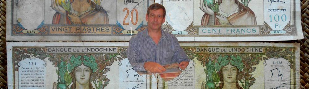 Revisaremos los billetes de 20 piastras de Indochina francesa de 1928-31, los 100 francos de Djibouti colonial de 1928-38, los 100 francos de Nueva Caledonia (Noumea) de 1963 y los 100 francos de la Polinesia francesa (Tahití) de 1961-65.