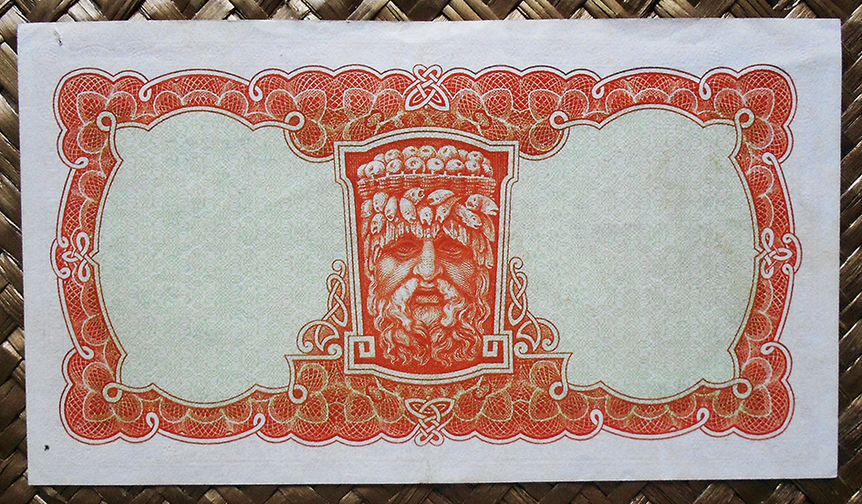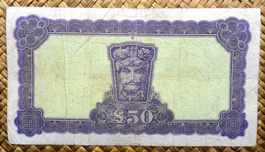 Billete de 50 pounds de 1975 con el espíritu del agua del río Shannon en su reverso.