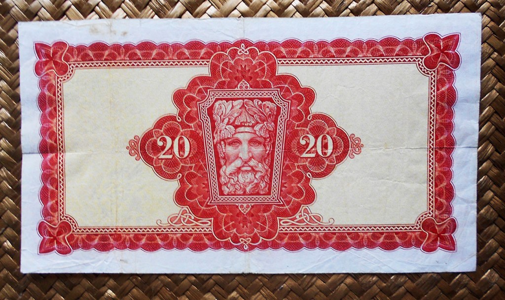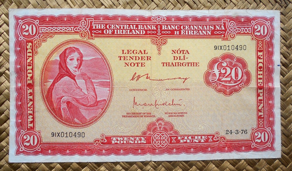 Billete de 20 pounds de 1976 con el espíritu del agua del río Boyne en su reverso.