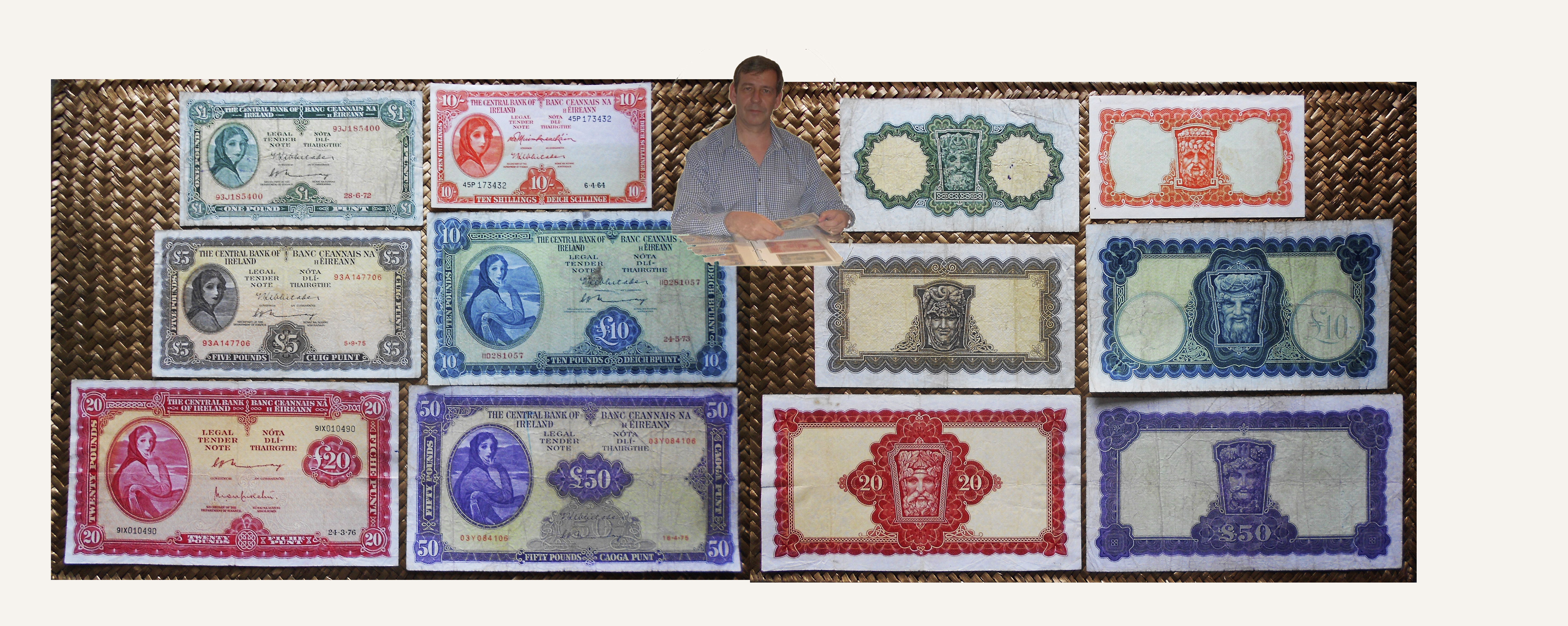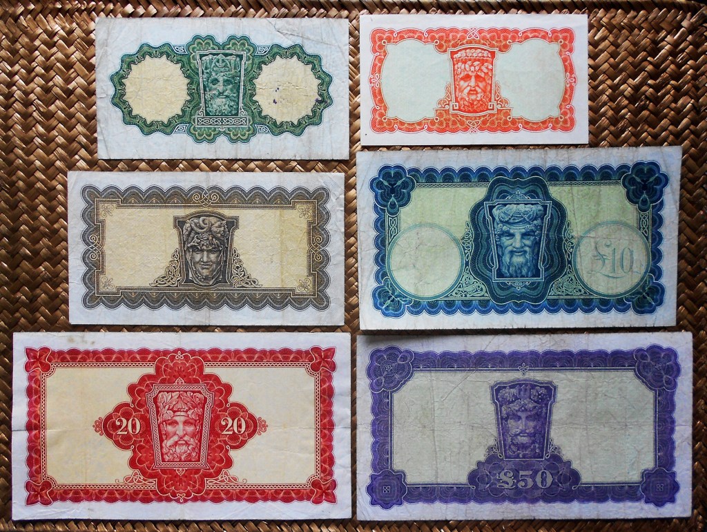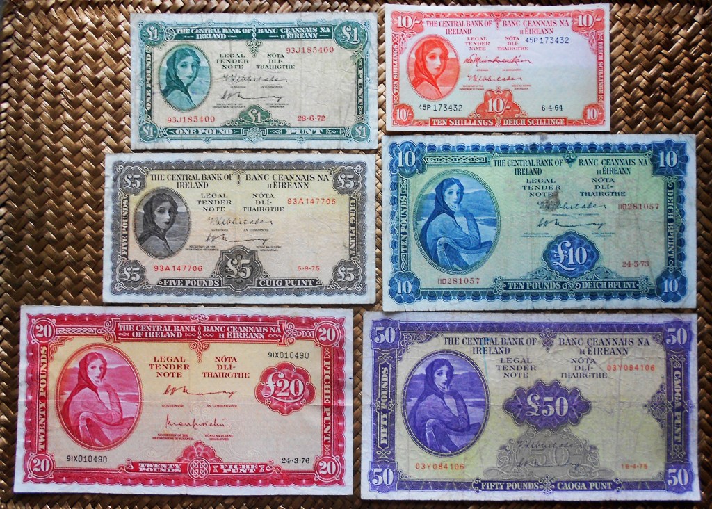 Se van a mostrar seis extraordinarios billetes de Irlanda emitidos por el Central Bank of Ireland en la década de los 60’ y ’70. Contemplaremos los billetes de 10 chelines de 1964, de 1 libra de 1972, de 5 libras de 1975, de 10 libras de 1973, de 20 libras de 1976 y de 50 libras de 1975.
