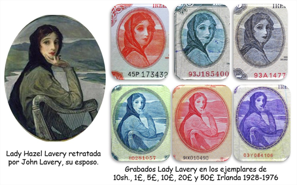 Antes un poco de historia entorno a este personaje: Lady Lavery (Hazel Martyn de soltera), americana de nacimiento (a finales del s. XIX), fue la segunda esposa de Sir John Lavery, quien la retrató propiciando que su obra fuese usada como representación alegórica de Irlanda, nada menos que durante casi 70 años (entre 1928 y 1976 formando parte visible de los anversos y entre 1976 y 1992 siendo la marca de agua de la siguiente serie).