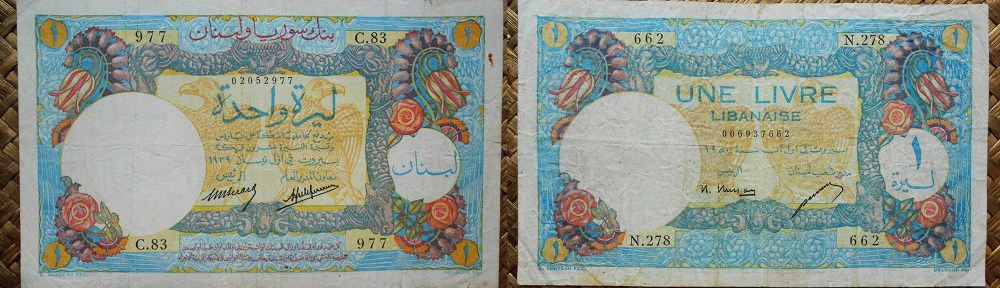 Vamos a contemplar dos billetes de 1 libra del Líbano de mediados del s.XX. La comparativa notafílica nos lleva hasta dos joyas del billetario libanés colonial y del billetario libanés independiente.