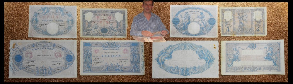 La serie francesa de billetes denominada “Bleu et Rose” (azul y rosa) fue concebida para atajar las falsificaciones que venían apareciendo a finales del s. XIX sobre la serie anterior, o serie “Bleu” (azul). El Banco de Francia decidió emitir una nueva serie, no muy distinta de la anterior, pero mucho más segura ante los falsificadores. Sobre la viñeta del tipo de 1862 de color predominantemente azul se estableció un fondo de seguridad en tono rosáceo que caracterizaría esta fantástica colección, …¡y la policromía se hizo “pour la France”!.