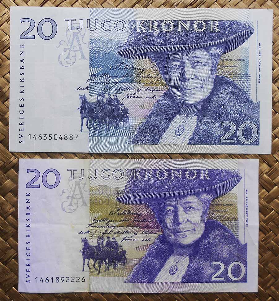 Compararemos seguidamente dos ejemplares de 20 coronas de Suecia de las emisiones de 1991-96 (veremos un billete de 1993) y de 1997-2014 (veremos un billete de 1999).
