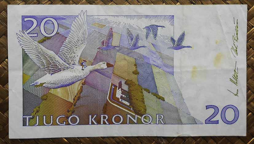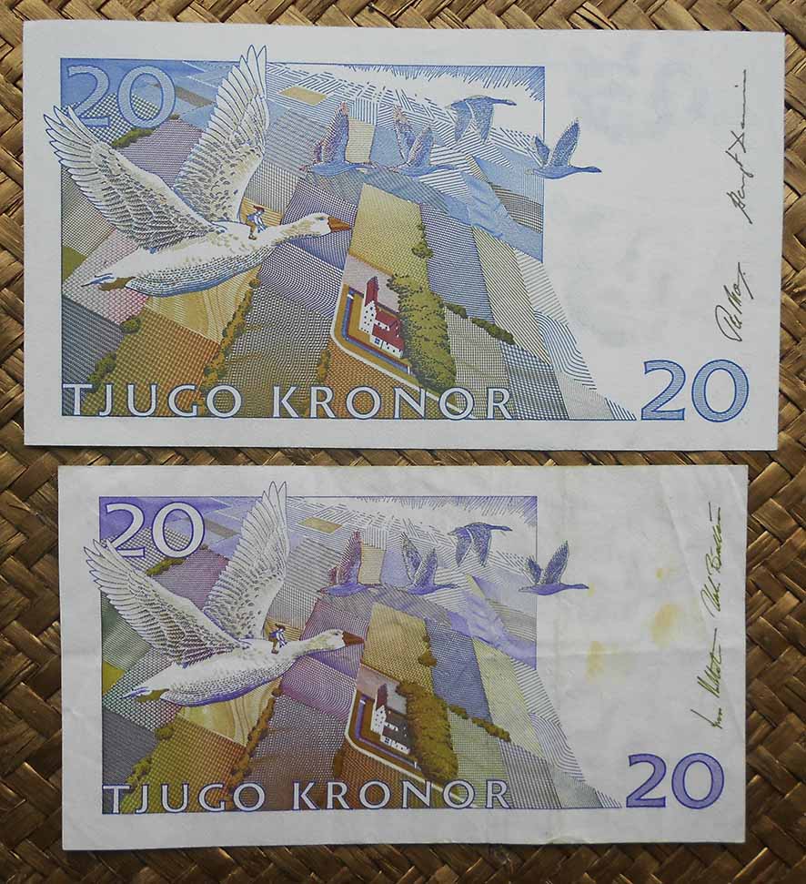 El billete de 20 coronas de 1993 lleva la firma de Bengt Dennis y el de 20 coronas de 1999 está firmado por Urban Bäckström.