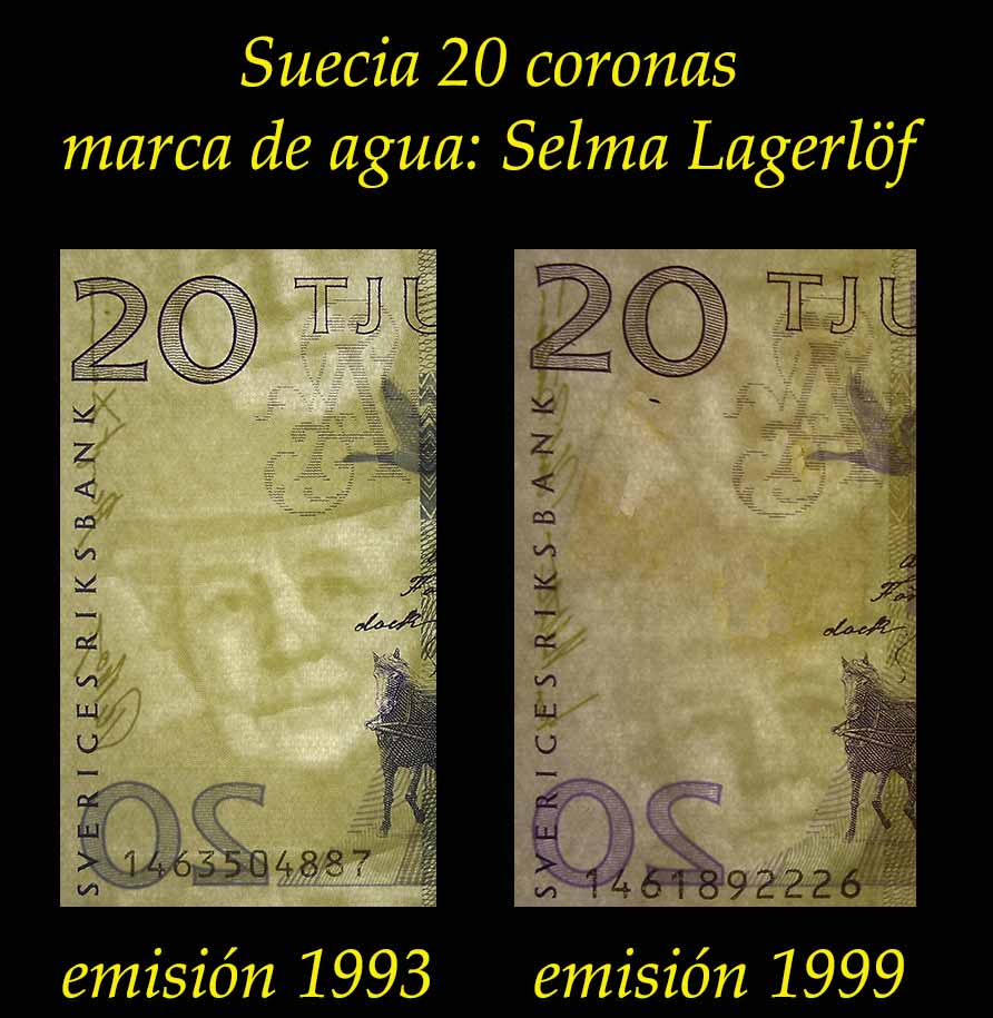 Compararemos seguidamente dos ejemplares de 20 coronas de Suecia de las emisiones de 1991-96 (veremos un billete de 1993) y de 1997-2014 (veremos un billete de 1999).