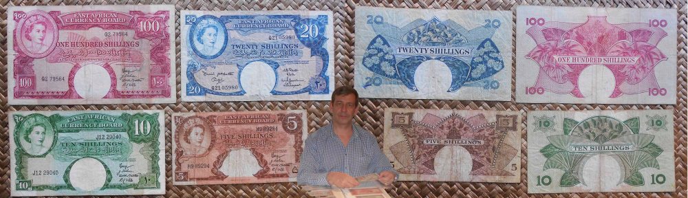 Los billetes que os presento son algunos de los ejemplares que se emitieron por la “East African Currency Board” para estas colonias africanas durante la administración británica, que finalizó en 1964.