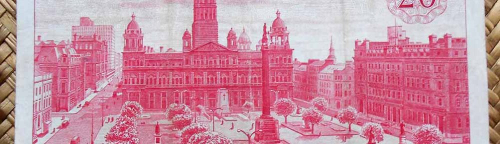 El billete de 20 pounds sterling de Escocia de 1964, emitido por el Clydesdale Bank Limited, nos muestra en su reverso una imagen aérea de la plaza George con el edificio del Ayuntamiento al fondo, la estatua de Walter Scott en el centro y un entorno de calles y edificaciones que la circundan.
