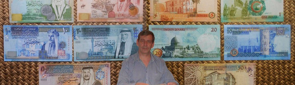 Os muestro una colorista serie de dinares que circulan en este país en los inicios del siglo XXI. Los anversos de los billetes de 1, 5, 10, 20 y 50 dinares nos muestran respectivamente a Hussein ibn Ali (Rey de Hejaz, emir de La Meca y padre de Abdala I), al Rey Abdala I, a Talal ibn Abdala (hijo de Abdala I y padre de Hussein I), al Rey Hussein I y al actual Rey Abdala II (hijo de Hussein I).