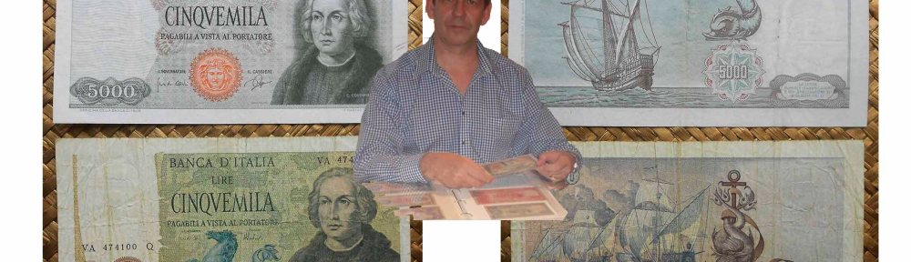 De manos del explorador más famoso de la Edad Moderna, vamos a comparar dos billetes de Italia del último tercio del siglo XX, los billetes de 5000 liras de 1964 y de 5000 liras de 1973. Ambos coinciden en presentarnos a Colón y a su entorno más conocido, el mar océano y las naves que le llevaron a descubrir América.