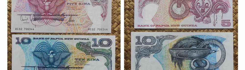 Vamos a contemplar una serie de Kinas (moneda adoptada) emitidas a finales del siglo XX por el “Bank of Papua New Guinea”, cuya característica identitaria es la representación del emblema nacional o “Bird of Paradise” (pájaro del Paraíso) apoyado en un “Kundu” (tambor tribal de madera tallada, en forma de reloj de arena, con membranas de piel de serpiente o de lagarto en sus extremos). Este grabado se repite en todos los anversos de la serie.