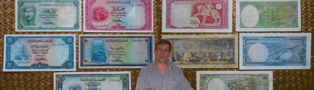 El último billete de la serie, de 50 rials de Yemen de 1971, nos ofrece dos jambiyas o dagas de hoja curva en sus respectivas vainas y cruzadas entre sí. Para finalizar esta iconográfica seríe no podía faltar la planta que dio vida al comercio de Yemen del Norte durante mucho tiempo, la rama del cafeto sobre las montañas yemenís. Tonalidades grisáceas y verde oliva. Lleva la firma de Ahmad-Abdu Said como Ministro del Tesoro.
