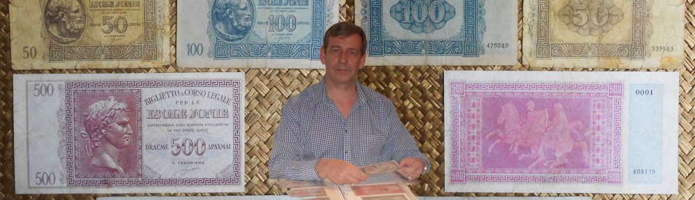 La serie de billetes que contemplamos forman parte de la emisión para estas “Isole Jonie” en 1942 por parte del gobierno italiano y para su uso en el territorio ocupado. Se emitieron dracmas en valores de 1, 5, 10, 50, 100, 500, 1000 y 5000, en billetes con textos en italiano y en griego y diseños con detalles escultóricos clásicos romanos y griegos.