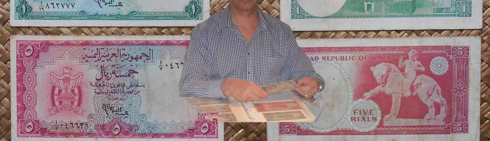 Seguimos en la península arábiga, en su zona meridional, para revisar la primera serie de billetes emitida en rials por la recién constituida República Árabe de Yemen o Yemen del Norte. Contemplaremos los billetes de 1, 5 y 10 rials de 1964 cuya semejanza nos ofrece en sus anversos el escudo de armas.