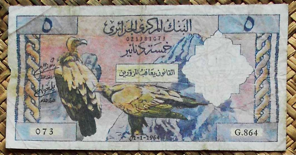 El billete de 5 dinares de Argelia libre de 1964 ofrece los textos y números en árabe en anverso y en francés en reverso. Cromaticidad multicolor sobre fondo predominantemente rosado. Emitido por el “Banque Centrale d’Algérie”, lleva las firmas de Seghir Mostefai como Gobernador y Bouasria Belghoula como Director General.