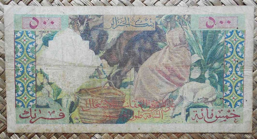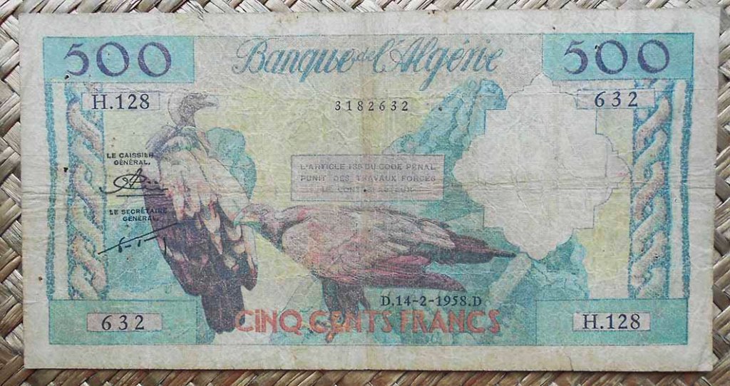 El billete de 500 francos de Argelia colonial de 1958 ofrece los textos en francés y numeración occidental en anverso y en árabe en reverso. Cromaticidad multicolor sobre fondo predominantemente verdoso. Emitido por el “Banque d’Algérie”, lleva las firmas de Civier como Cajero General y Gandy como Secretario General.