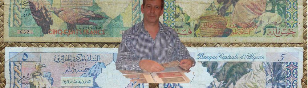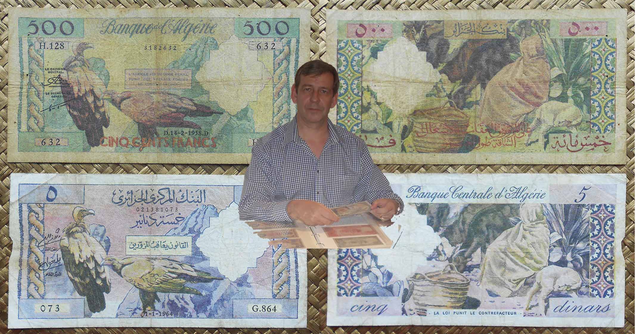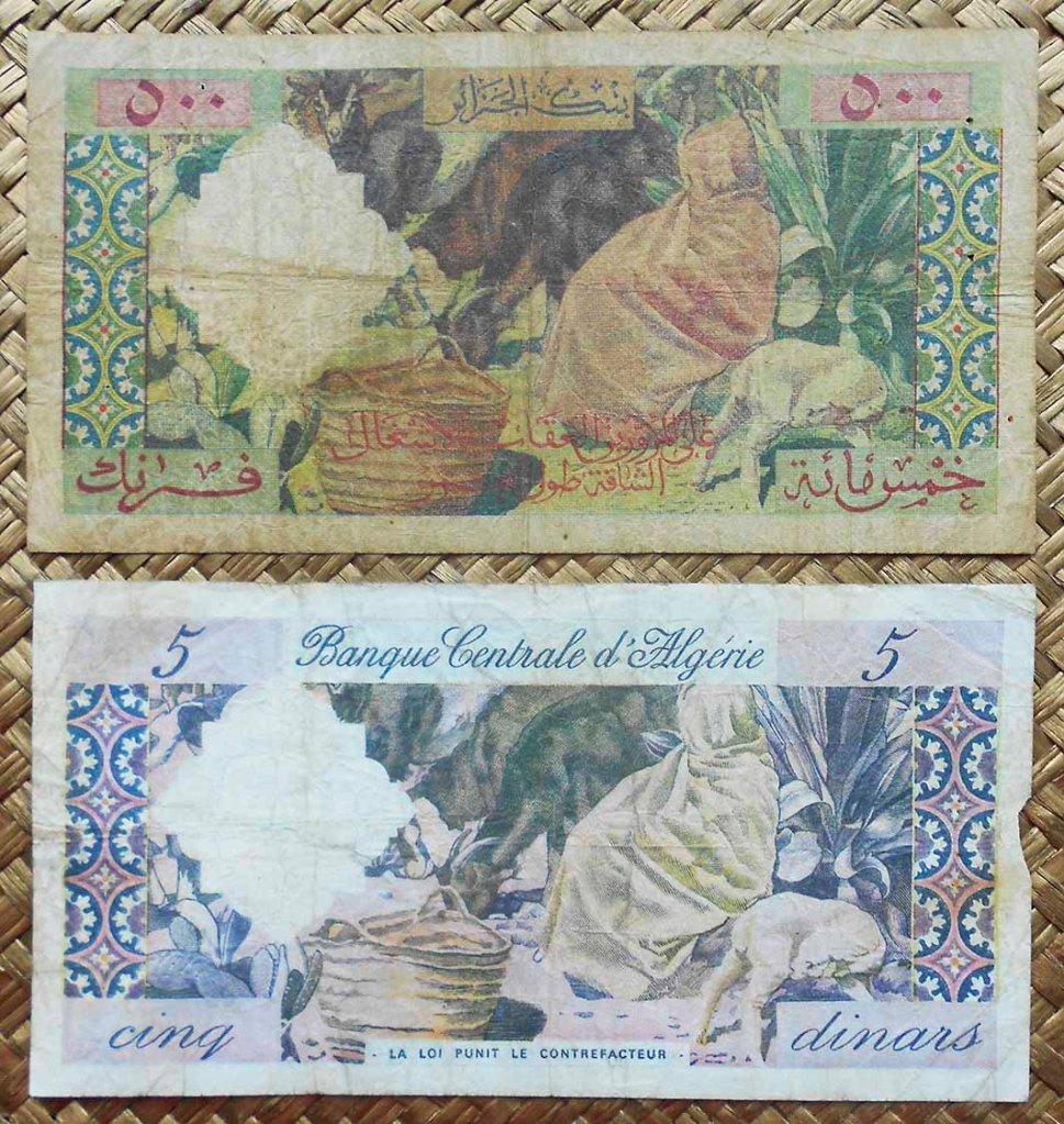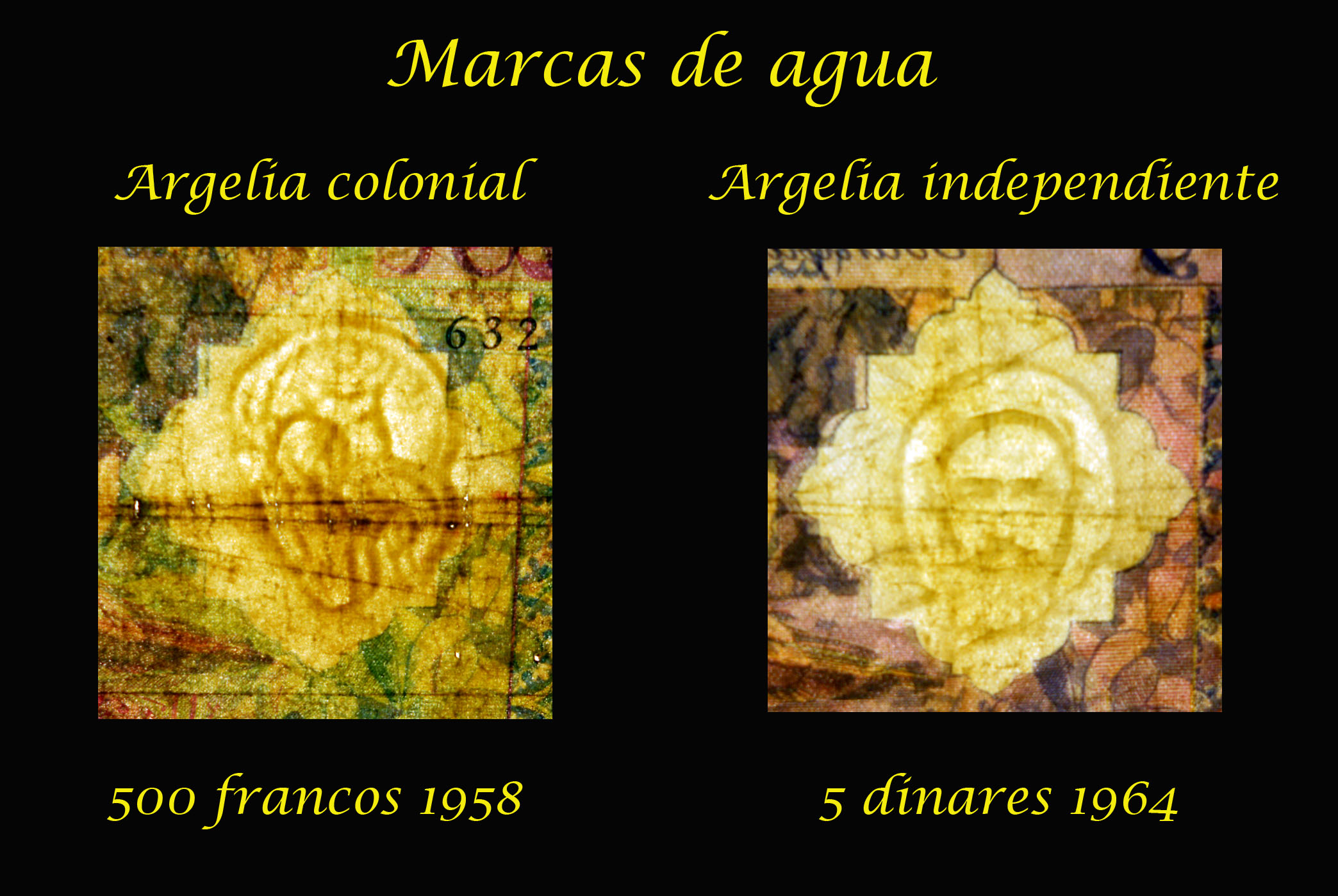 Compararemos los 500 francos de Argelia colonial francesa de 1958 con los 5 dinares de la Argelia libre de 1964. Idénticos tanto en grabados y composiciones de anversos y reversos pero diferentes en tres características, sus marcas de agua o filigranas, los textos en árabe o francés que los acompañan y las tonalidades de color usadas para cada uno.