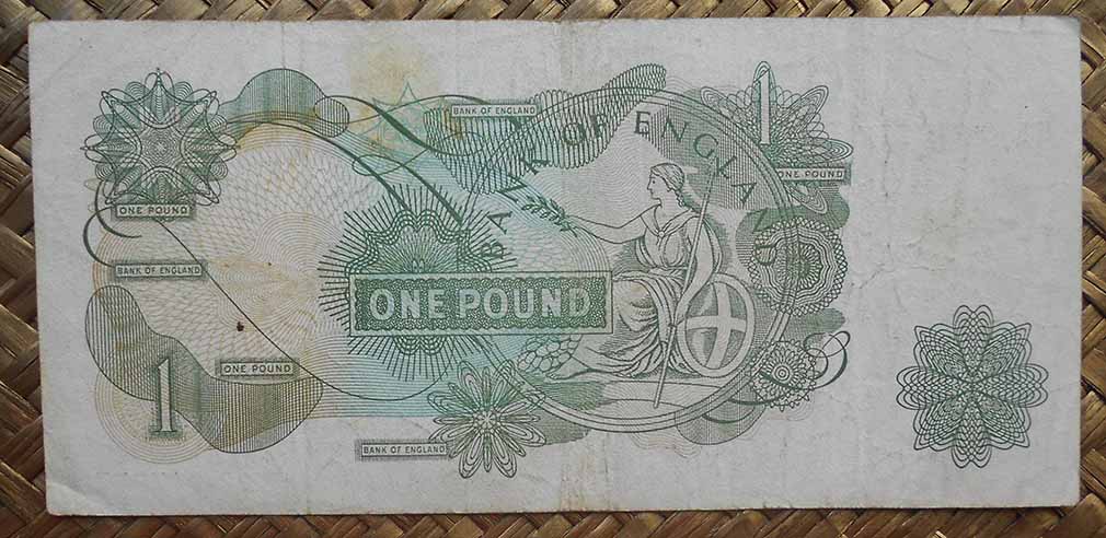 El billete de 1 libra de Reino Unido de 1970-77 nos ofrece en su anverso a Isabel II en un óvalo a la derecha, bordeado interiormente con el nombre de la monarca “Elizabeth R”; a su lado y hacia el pie central el logo del Banco con Britannia sentada con escudo, lanza, rama de olivo y monedas a sus pies. En el reverso se repite el logo del Banco entre guilloches y rosetas con los textos y valores del billete. De cromaticidad predominante verde, lleva la firma de John Brangwyn Page como Jefe de Caja.