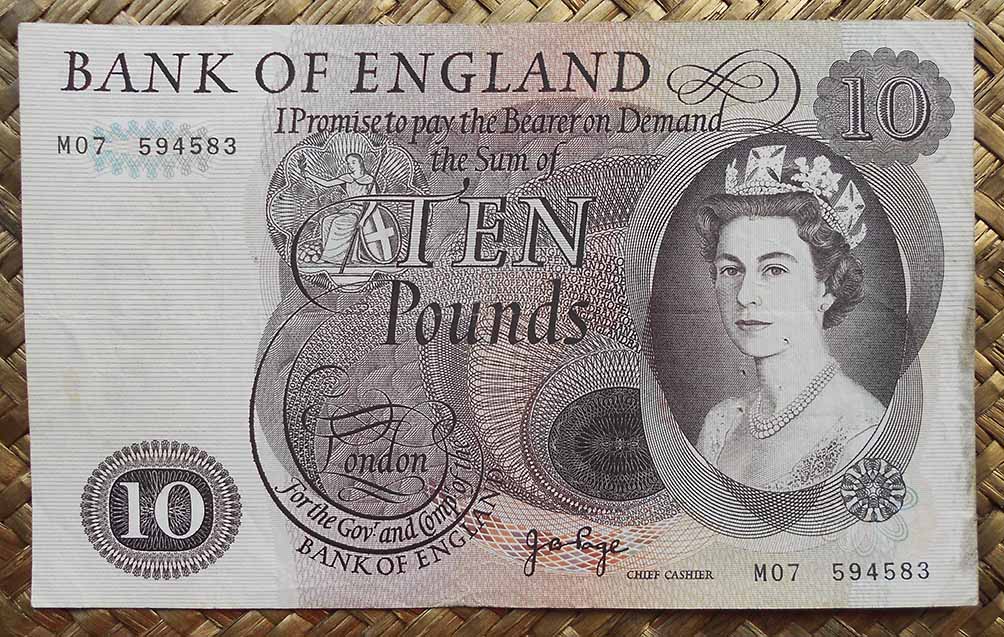 El billete de 10 libras de Reino Unido de 1970-75 nos ofrece en su anverso a Isabel II en un óvalo a la derecha; en la parte superior izquierda un pequeño medallón con Britannia como logo del Banco. De cromaticidad predominante marrón grisácea, lleva la firma de John Brangwyn Page como Jefe de Caja. La serie M del ejemplar mostrado fue utilizada como emisión de reposición.