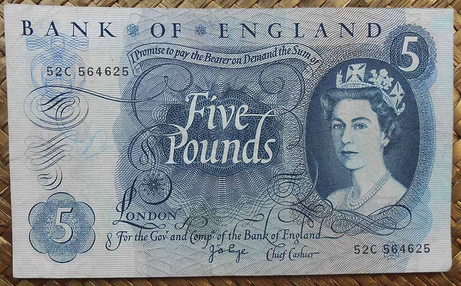 El billete de 5 libras de Reino Unido de 1970-71 nos muestra en su anverso a Isabel II en un óvalo a la derecha. En el reverso un medallón formado por ocho círculos perimetrales y en su interior la personificación de Britannia con lanza, escudo, rama de olivo y monedas a sus pies. De cromaticidad predominante azul, lleva la firma de John Brangwyn Page como Jefe de Caja.