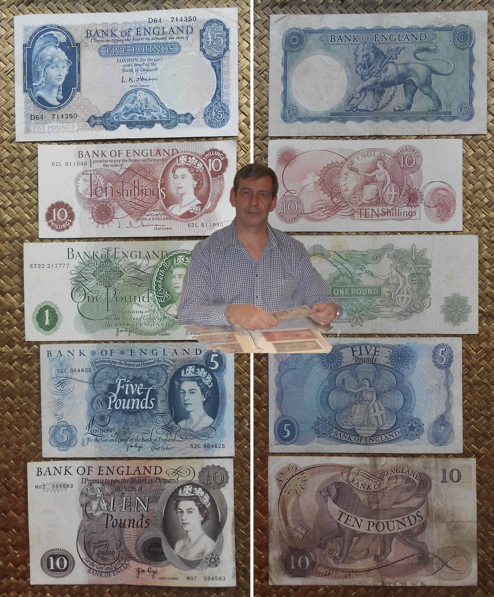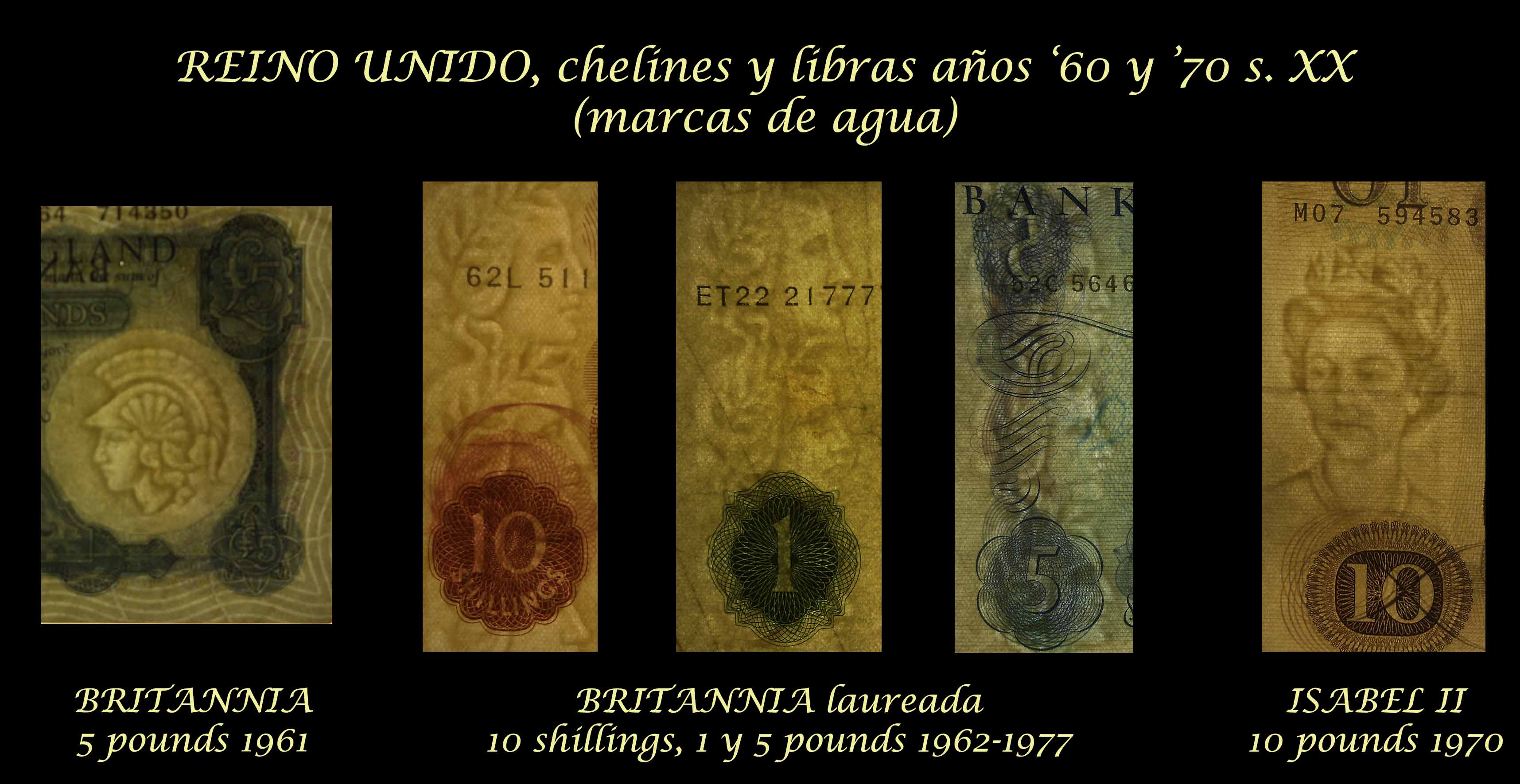 Vamos a revisar los billetes de 10 shillings de 1962-66, 1 pound de 1970-77, 5 pounds de 1970-71 y 10 pounds de 1970-75, todos ellos con el retrato de Isabel II presidiendo sus anversos. También veremos el billete de 5 pounds de 1961-63 presidido por la cabeza alegórica de Britannia.