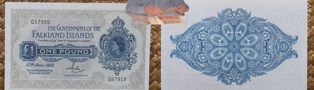 Esta vez nos desplazamos al hemisferio sur atlántico, de la mano de tres ejemplares correspondientes al primer diseño para billetes de las islas Malvinas en los que aparece la dama más retratada del billetario mundial, la reina Isabel II del Reino Unido.