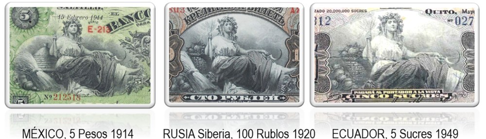 Contemplaremos los billetes de 5 pesos de México de 1914 (del Banco de Coahuila), de 100 rublos de 1918 del Gobierno Provisional de East Siberia (región rusa de Priamur) y de 5 sucres de 1949 de Ecuador. Los tres ejemplares están presididos por la diosa de la Agricultura, la Cosecha y la Fecundidad, portando en sus manos una antorcha de espigas de trigo y una hoz, y rodeada de frutas, racimos de uvas y fardos de mieses. Unos grabados realmente artísticos y bien aceptados por los países receptores.