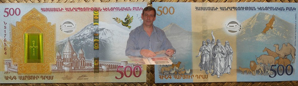 El billete de 500 dram de 2017 conmemora el relato bíblico del Arca de Noé y el Diluvio universal (Génesis capítulos 6 al 9), que nos narra como el patriarca Noé construyó un barco para salvar del diluvio a su familia y a los animales que le fueron enviados, y asegurar la repoblación de la Tierra cuando el agua retrocediese.