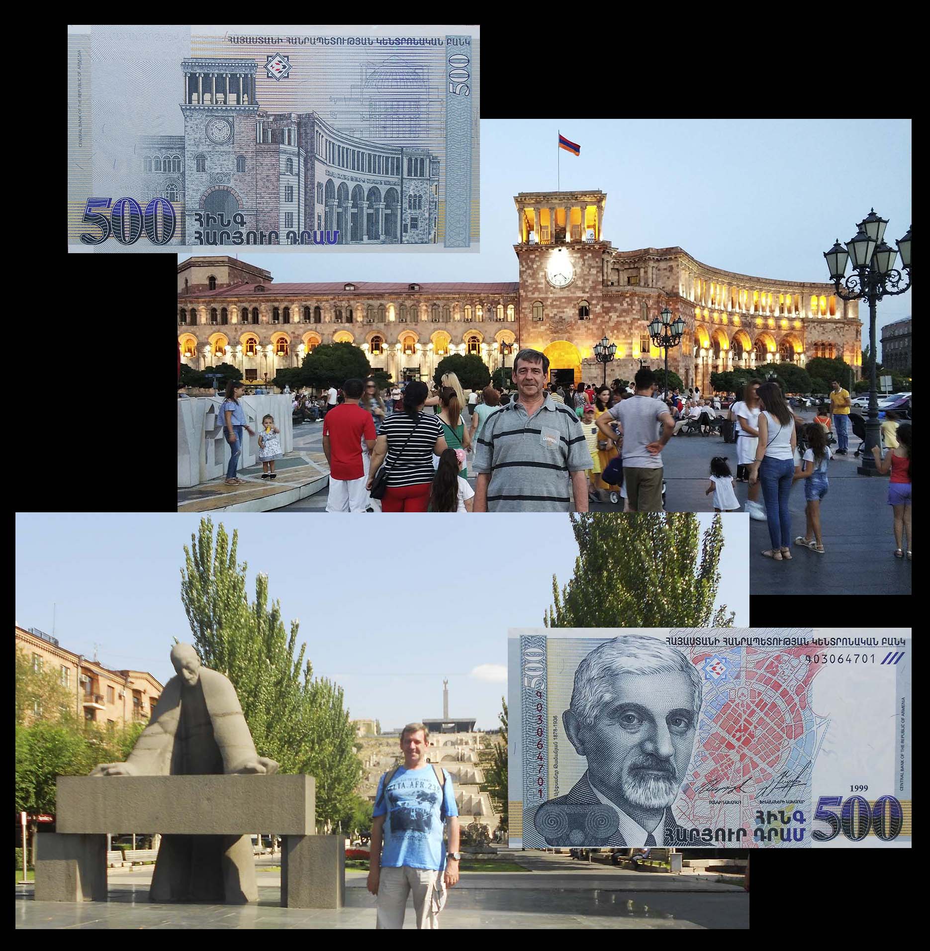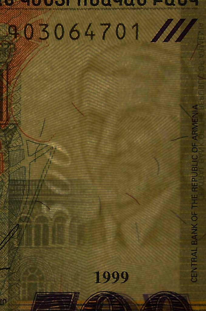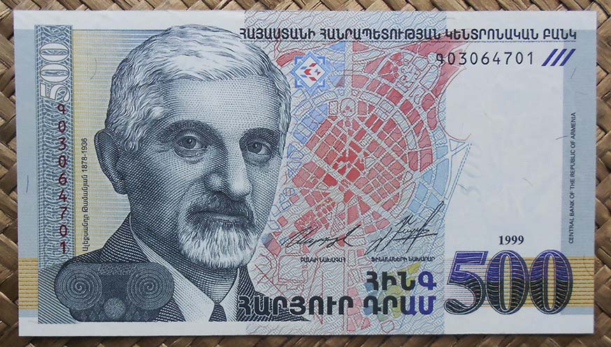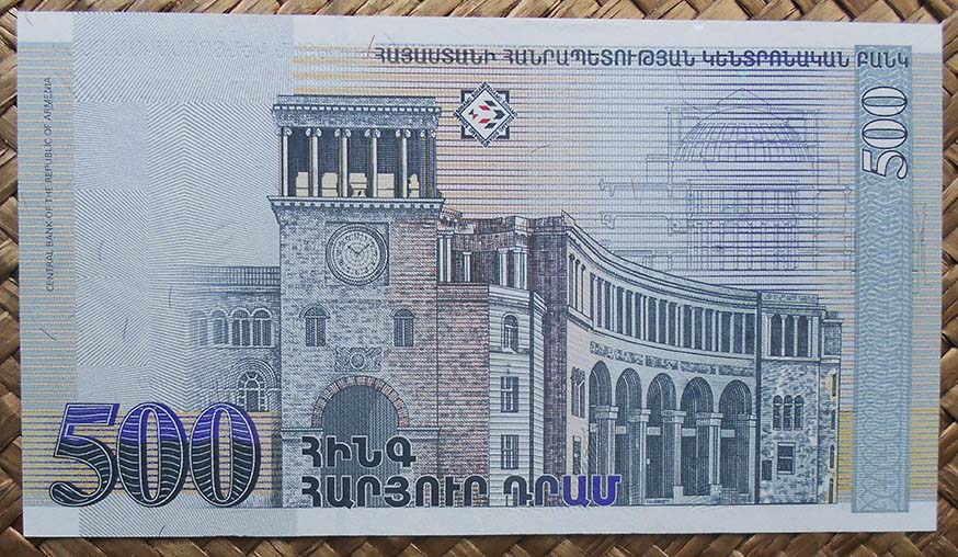 El billete de 500 dram de Armenia de 1999 nos ofrece en su reverso una imagen del edificio que alberga el Gobierno armenio y es sede del Ministerio de Asuntos Exteriores. El edificio fue diseñado por el arquitecto ruso, nacido en Yekaterinoda, Alexander Tamanian (1878-1936). De estilo neoclásico, su construcción se inició en 1926 y concluyó en 1929, aunque sería remodelada por su hijo, Gevorg Tamanian, a partir de 1941.