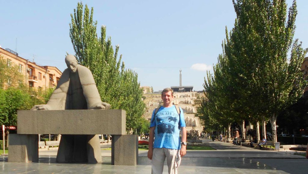 A los pies de la escalinata conocida como la Cascada (complejo arquitectónico a distintos niveles con fuentes, jardines y esculturas modernistas) en Yereván, se alza un monumento que representa a Alexander Tamanian en pie contemplando sus planos sobre una mesa.