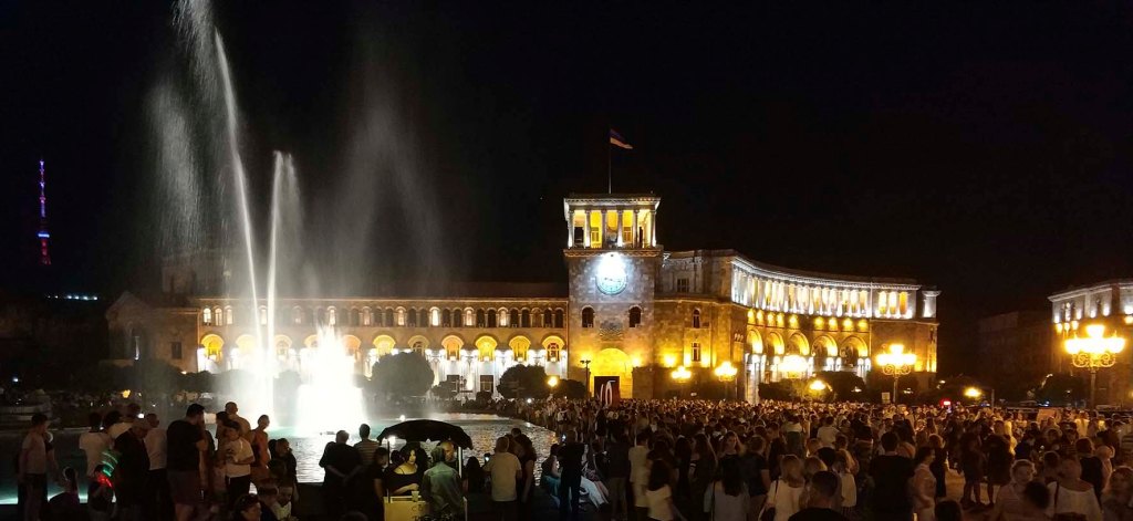 En el centro de la plaza una gran fuente ameniza con espectáculos de luz y sonido las tardes de verano, convirtiendo ese enclave en el centro social más popular de la capital armenia.