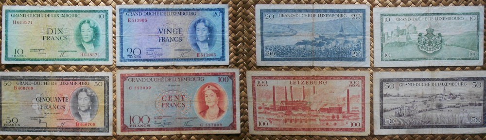 Revisaremos los billetes de Luxemburgo de 10 francos de 1954, de 20 francos de 1955, de 50 francos de 1961 y de 100 francos de 1956 y 1963. El busto de la Gran Duquesa Carlota aparecerá en los anversos de todos los valores de la serie. Textos en francés y números de serie en color rojo.