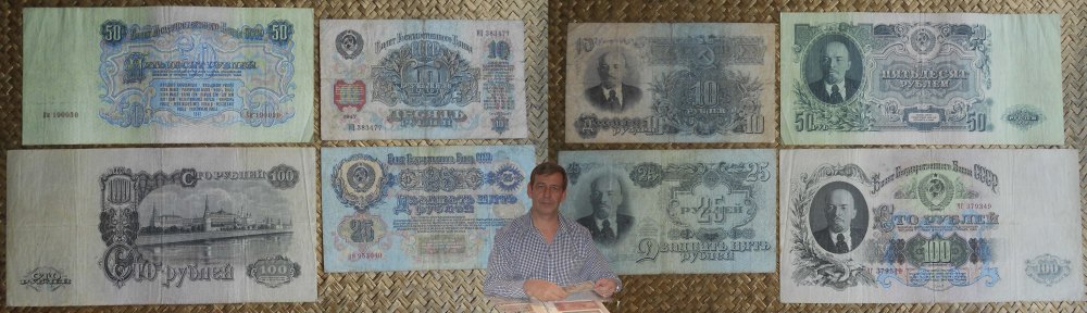 Los billetes de 10, 25, 50 y 100 rublos de 1947 nos muestran a Lenin simultaneando anversos y reversos, mientras que los lados opuestos ofrecen unos diseños florales muy artísticos entre sus cartuchos y bloques de texto, siempre (claro está) acompañados en alguna zona del mismo del símbolo soviético por excelencia: la hoz y el martillo sobre un globo terráqueo, rodeado de coronas de espigas y presidido por la estrella.
