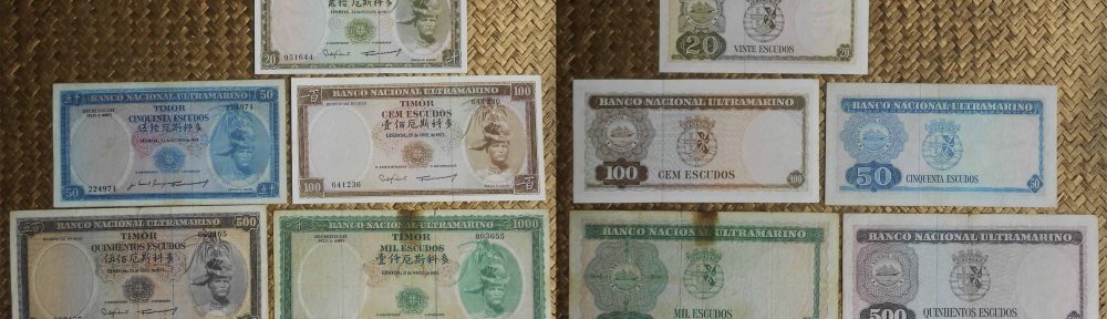 Os presento los billetes del Timor portugués de 20 y 50 escudos de 1967, 100 y 500 escudos de 1963 y 1000 escudos de 1968. El personaje que nos muestra la serie, en todos sus anversos, es Régulo Dom Aleixo (1866-1943), timorense “muy portugués” que defendió hasta la muerte la bandera portuguesa, vida que le arrebataron los japoneses cuando invadieron Timor en la II Guerra Mundial. También veremos en los anversos el escudo de Portugal, en cuyo blasón aparece la quina (5 pequeños escudos) rodeada de siete castillos de tres torres, todo ello sobre una esfera armilar y ramas de laurel.