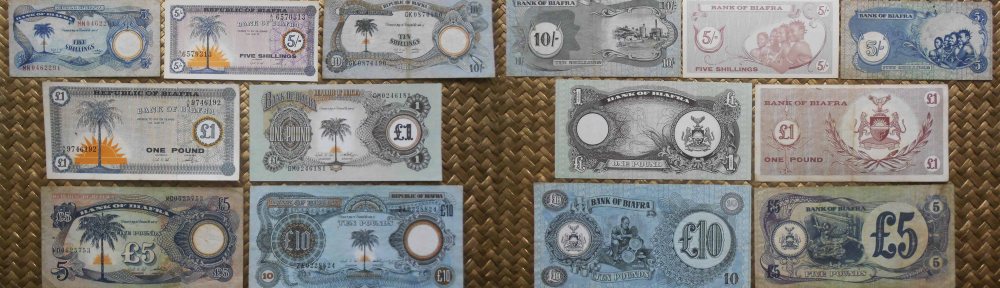 Durante este breve período de independencia (más bien de guerra civil) se emitieron dos series de billetes como papel moneda. Revisaremos la primera emisión, de 1967, con los valores de 5 chelines y 1 libra, y la segunda emisión, de 1968-69, con los valores de 5 y 10 chelines y 1, 5 y 10 libras.
