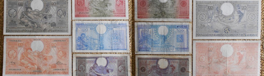 Durante la 2ª Guerra Mundial Bélgica se mantuvo ocupada por las tropas alemanas más de cuatro años. Los billetes que vamos a revisar coexistieron al comienzo y final de esta ocupación. Contemplaremos los ejemplares de 100 francos/20 belgas de 1943, 100 francos/20 belgas de 1944, ambos de diseños anteriores a la ocupación y los billetes de 100 francos/20 belgas, 500 francos/100 belgas y 1000 francos/200 belgas, de 1944 (fechados 1943) pero del tipo emitido en el exilio, en Inglaterra, por la imprenta Bradbury, Wilkinsons & Co (BWC) en nombre del Banque Nationale de Belgique.