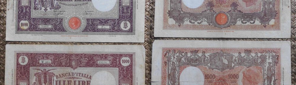 Vamos a revisar las emisiones del billete de 1000 liras tipo “Barbetti M grande”, iniciadas en 1897 y mantenidas hasta 1950 con muy pocos cambios en sus distintas ediciones. Además contemplaremos los ejemplares de 1000 liras de Italia de 1943 y de 1946.