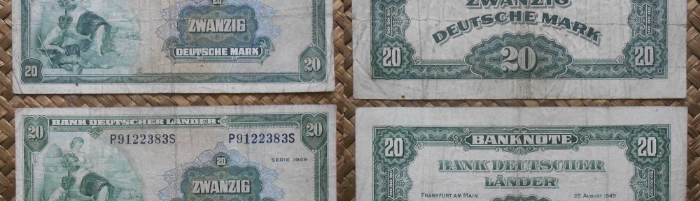 Desde “Semejanzas” nos ubicamos en los primeros pasos de la República Federal de Alemania, tras la 2ª Guerra Mundial. Su billetario estrenaría el nuevo marco alemán (“deutsche mark”) en 1948, y lo iba a mantener hasta 1999, fecha en la que la ya unificada Alemania entraría a formar parte del Euro.
