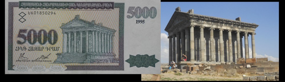 El billete de 5.000 dram de Armenia de 1995 nos ofrece en su anverso una vista ladeada del Templo de Garni. Fue diseñado por los artistas armenios Hrachya Aslanyan y Ashot Manukyan.