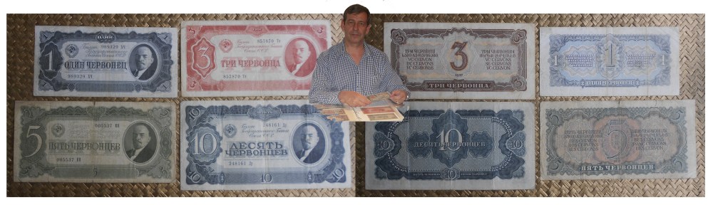 Contemplaremos la serie de billetes que, para conmemorar el 20ª Aniversario de la Revolución, se emitió con los valores de 1 chervonetz, 3,  5 y 10 chervontsev de Rusia en 1937. Emitidos por el Banco Estatal de la U.R.S.S., todos ellos nos ofrecen en sus anversos la imagen de Vladímir Ilich Uliánov, alias Lenin, con traje y corbata. Lo acompaña el escudo de la Russian Soviet Federative Socialist Republic (RSFSR) con las cintas representando a sus repúblicas encintando gavillas de espigas de trigo, éstas rodean el globo terráqueo sobre el que se cruzan la hoz y el martillo.