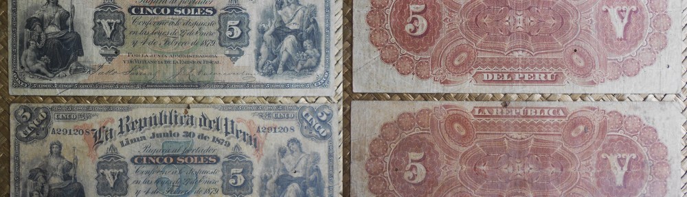 Los billetes que contemplamos son la emisión de 5 soles de Perú de 1879 conocida como “doble V” y los 5 soles de Perú de 1879 conocidos como “rayos”. Ambas vieron la luz a finales del siglo XIX a las puertas de la Guerra del Pacífico, que enfrentaría en 1879 a los países de Perú, Bolivia y Chile. El 5 de abril de 1879 Chile formuló su Declaración de Guerra al Perú y a Bolivia dando así inicio a la llamada “Guerra del Pacífico”, que mantuvo enfrentados a Bolivia (hasta 1880) y a Perú con Chile hasta 1884.