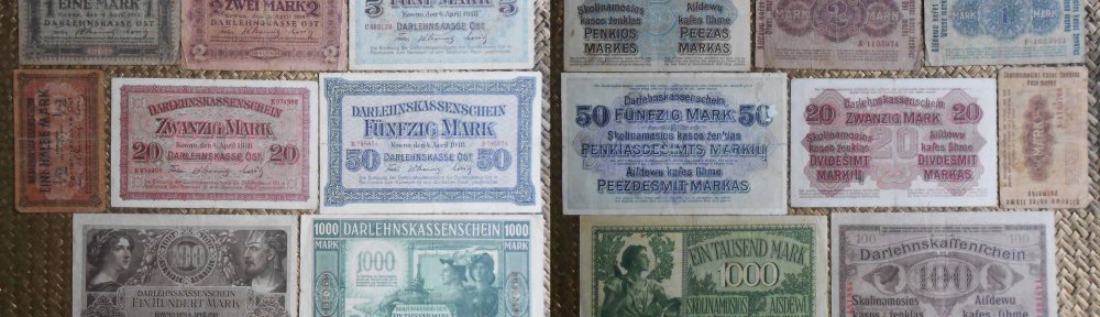 Temporalmente nos situamos en los años de ocupación alemana de los territorios de la actual Lituania para repasar una peculiar serie de billetes emitidos justo cuando acababa la guerra y los ocupantes iniciaban su retirada. En 1918, los perdedores de la contienda habían financiado a Lituania, que ya saboreaba la independencia pero que no disponía de medios ni de fondos para lanzarse de forma autónoma. El Darlehnskasse de Kowno (actual Kaunas), sucursal del Banco alemán de Comercio en los territorios ocupados orientales, emitió una serie de marcos que llamarían OstMark, en paridad con el marco alemán o PapierMark y cambiable por ½ OstRubel o rublo ruso de la zona oriental ocupada (territorios de Polonia, Letonia y Lituania).