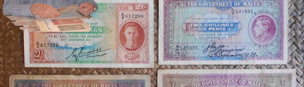Vamos a contemplar la serie de chelines y libras emitida para las islas por el colonizador británico a las puertas de la 2ª Guerra Mundial, billetario que mantendría durante los años de la contienda, que le afectaría de pleno como colonia bajo la tutela de uno de los países aliados contra el eje alemán-italo-nipón. Revisamos los billetes de Malta de 1 chelín de 1943, 2 chelines de 1942, 2 chelines 6 peniques de 1939, 10 chelines de 1939 y una libra de 1940.