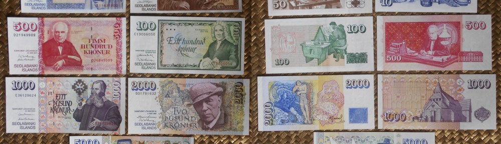 Contemplaremos los billetes de Islandia de 10 coronas de 1981, de 50 coronas de 1981, de 100 coronas de 1981, de 500 coronas de 2004, de 1.000 coronas de 2005, de 2.000 coronas de 1995 y de 5.000 coronas de 2001.