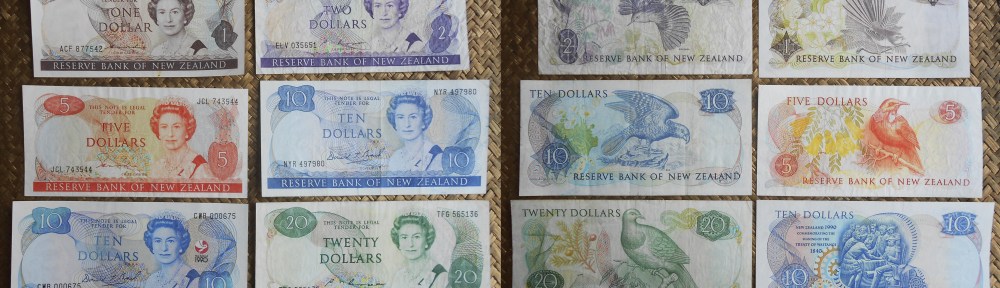Vamos a repasar el billetario con el retrato de la reina británica que emitieron en la década de los años ’80 del pasado siglo. Contemplaremos los billetes de Nueva Zelanda de 1 y 5 dólares de 1981-85, de 2 y 20 dólares de 1985-89, de 10 dólares de 1989-92 y la emisión de 10 dólares de 1990 conmemorativa de los 150 años del Tratado de Waitangi (1840) entre el pueblo maorí y la reina Victoria I. Fueron impresos por Bradbury, Wilkinson & Co (NZ) Ltd. de Whangarei, en la isla Norte de Nueva Zelanda.