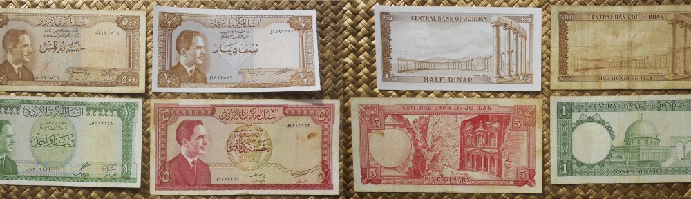 Vamos a revisar billetes jordanos de los años ’60 y ’70 del pasado siglo emitidos por el Central Bank of Jordan en su 1ª y 2ª edición. Contemplaremos los valores de 500 fils de 1959, ½ dinar de 1973, 1 dinar y 5 dinares de L1959-2ªed. (no fechados). Sus anversos nos ofrecen cabeza y torso ladeado de un joven rey Hussein I en traje civil. Textos y numeraciones en árabe, marcos y cicloides en tonalidades monocolor por valores.