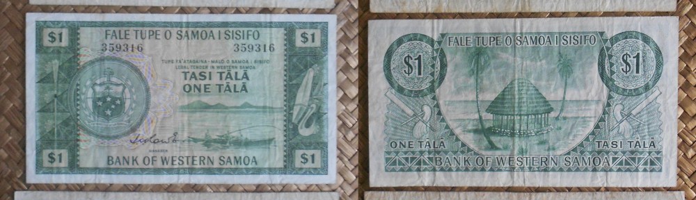 Los billetes que vamos a revisar se corresponden con la primera edición como nación independiente, en 1963, del Fale Tupe O Samoa/Sisifo (Bank of Western Samoa) en shillings/pounds y la primera emisión del mismo Banco pero ya con su nueva moneda, el tala, de 1967. Contemplamos los billetes de 10 shilling de Western Samoa de 1963, de 1 tala de Western Samoa de 1967 y de 2 tala de Western Samoa de 1967. Fueron impresos por la compañía Bradbury, Wilkinson & Sons de Londres.
