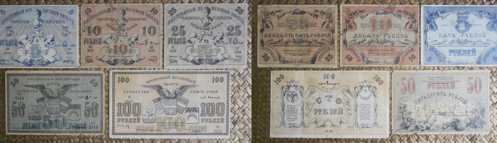 Contemplaremos los billetes emitidos en 1918 para Taskent (capital del Turkestán Ruso) y en 1919 para el Distrito del Turkestán. Revisaremos los ejemplares de 10 y 25 rublos de Turkestán -Taskent de 1918, el ejemplar de 5 y de 100 rublos de 1918 y el de 50 rublos de 1919 de Turkestán District.