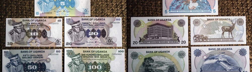 Revisaremos esta vez un billetario de culto al personaje, en la figura de Idi Amin, quien fuera gobernador militar de este territorio entre 1971 y 1979. Contemplaremos los billetes de 5 chelines de Uganda de 1977 y los ejemplares de 10, 20, 50 y 100 chelines de Uganda de 1973. Fueron impresos por la compañía inglesa De la Rue Company Limited PLC.